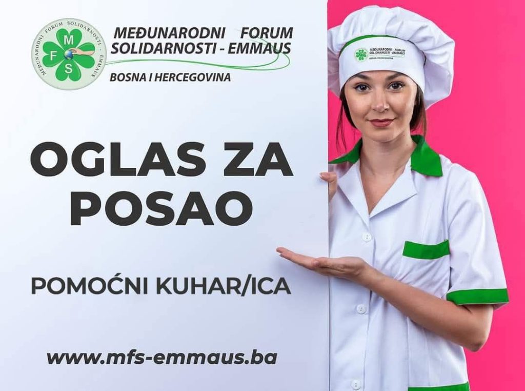 ČITAJ VIŠEPomoćni kuhar/ica Zbog ukazane sve veće potrebe, Udruženje HO MFS-EMMAUS Doboj Istok raspisuje oglas za prijem pomoćnog kuhara/ice. Mjesto rada: -Ured Srebrenica ( više izvršilaca) Poželjno ali ne i neophodno radno iskustvo na istim ili sličnim poslovima. Prijave slati na mail: info.ifs@mfs-emmaus.ba ili na broj telefona +387 35 726 690 Prijavu možete popuniti i na […]